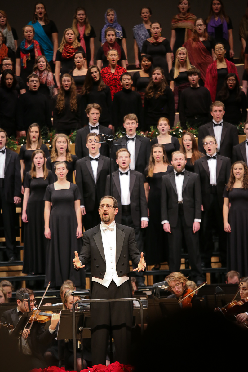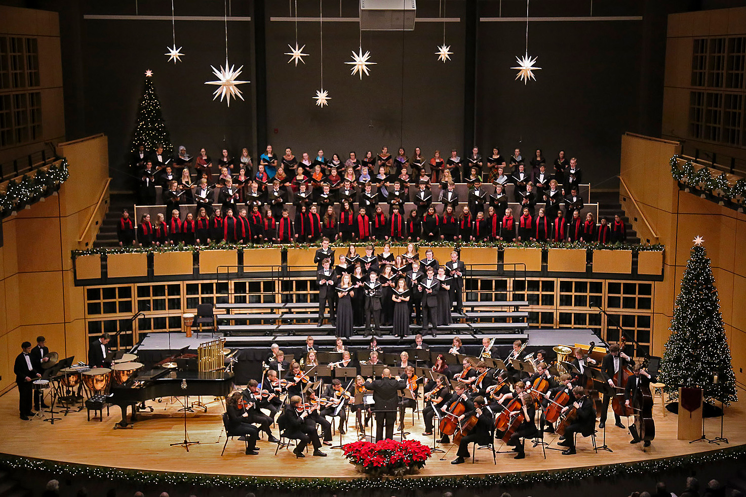 This special celebration of the holiday season will feature four choirs and an orchestra, along with audience participation on traditional carols, all in a concert hall festively decorated with garlands, lights and trees.