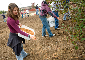 Goshen College junior Alana Kenagy, from Albany, Ore., and other students help plant a mix of prairie grasses and flowers in the south corner of campus in October 2009.