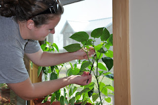 Late in the last growing season, we had started a few pepper plants in the greenhouse. Once the nights began to get too cold for the delicate plantlets, we brought them indoors and placed them on a south-facing window sill. With a little t.l.c. throughout the winter, all six of the plants survived! The picture shows the first pepper blossom that opened on a snowy, winter’s day. In the absence of insect pollinators we needed to pollinate the flowers ourselves. At this point, each plant has one to three peppers developing.