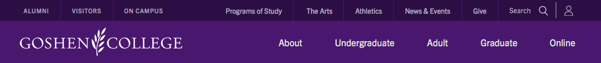 A new purple bar at the top of goshen.edu will help visitors navigate to high traffic pages and Web resources (the former navigation had navigation that ran down the left side of pages and across the top). The bar will also “stick” to the top of the page as you scroll down any page.