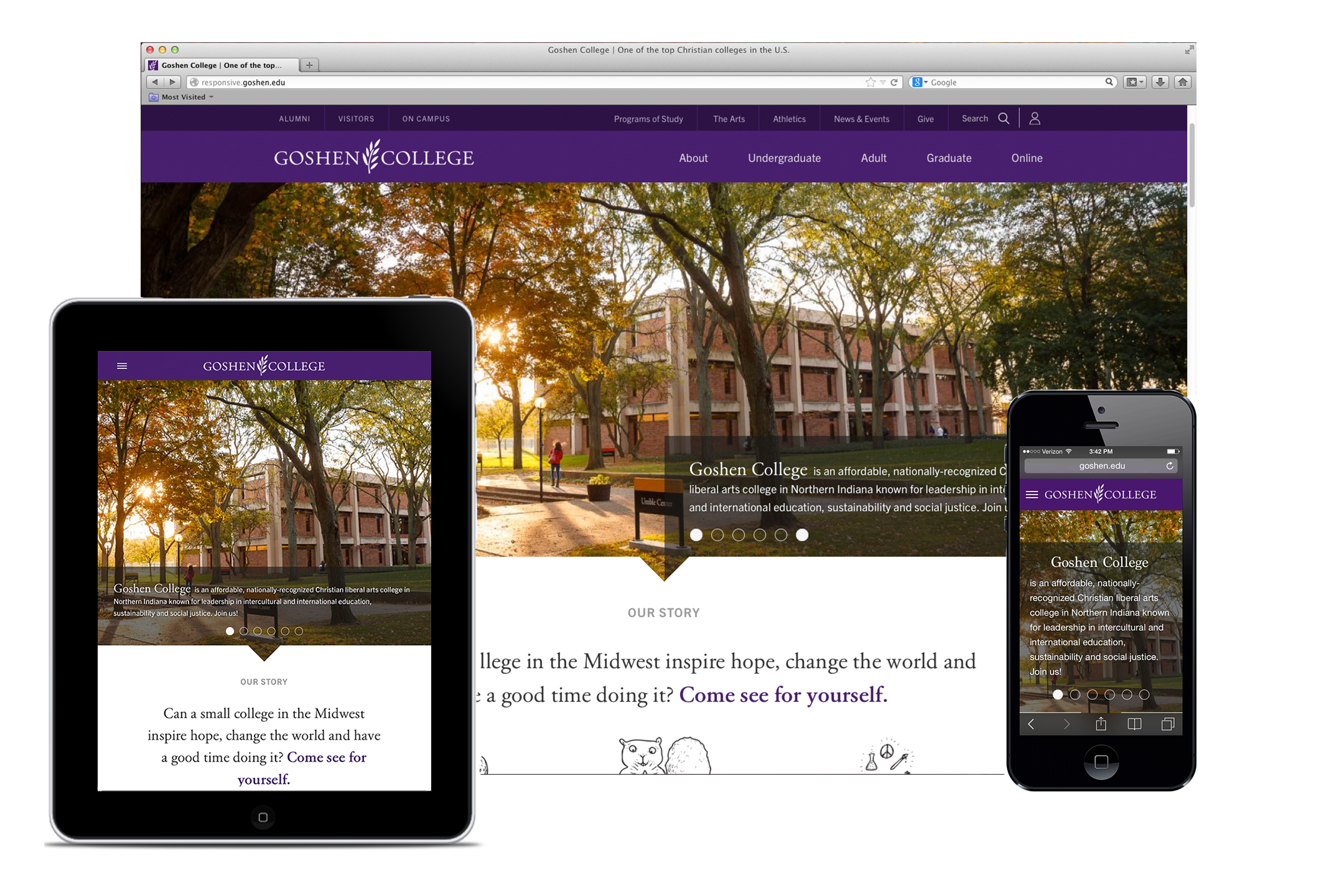 As stated above, the primary goal for Goshen’s website redesign is to build a site that serves college content to audiences on any device. This content, whether text, images, links or videos, is designed using site-wide “responsive” technology to be easily readable/viewable on a desktop computer, tablet, phone or even a large-screen television.